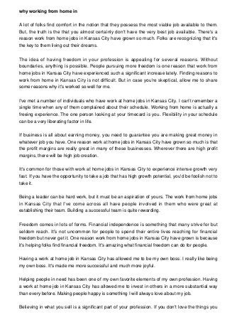 Work From Home Jobs Kansas City. By simply completing easy online surveys and tasks, you can accumulate some good money to pay some bills. Search for jobs hiring in your area using ZipRecruiter's job search engine - the best way to find a job.